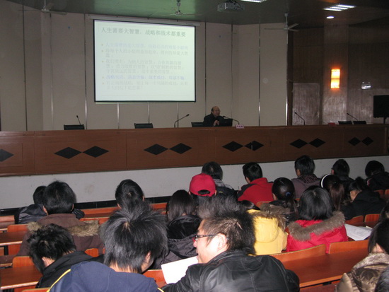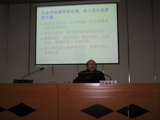 12月22日晚,学生处副处长许迪楼老师在院图文信息中心一楼报告厅作“生态思维与职业生涯规划”专题讲座,来自全院的六百余名师生聆听了讲座。 许老师首先解释了生态学思维方式的内涵与特点,介绍了生态学法则及生态价值原则,然后他引导同学们从生态学视角审视职业生涯规划,说明根据生态学基本理论观照职业生涯规划的视角和方法。他说,生态学是一种天人关系的思维方法,个人的职业生涯总是要融入自然-社会-经济复合系统之中,教育同学们在今后的择业与工作中要具有开放性的思维视野、前瞻性的思维战略及和谐性的价值取向。 许处长的报告主题新颖、逻辑性强、说理透析、风趣睿智,理论与实际互相融通,具有很强的指导性,与会师生深受启发。