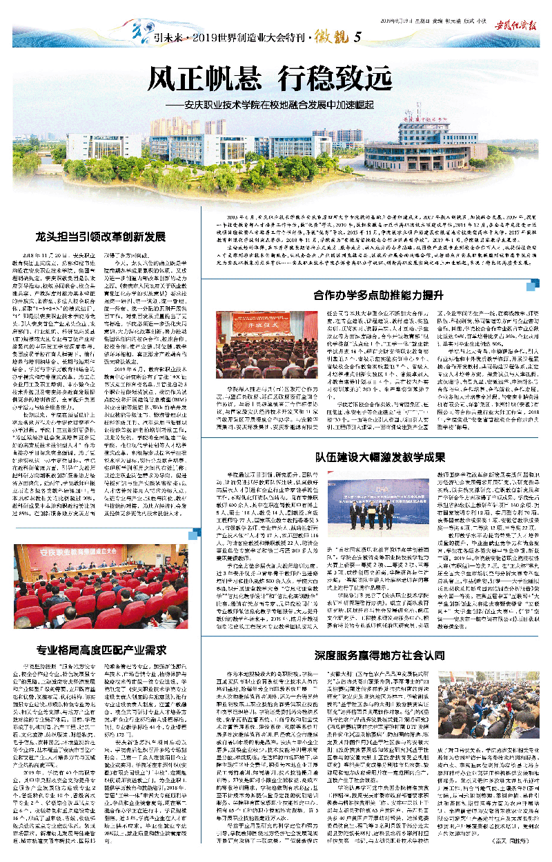 这些成绩的取得,离不开学院长期坚持立足地方、服务地方、融入地方的办学思路。从围绕产业设专业到校企合作育人才,从提供技能型人才支撑到推出技术创新服务,从服务企业、产业园区到直接与县、区政府开展全面战略合作,从推动成立安庆职教联盟到被市委市政府确定为安庆职教集团龙头单位……beat365体育官网平台在探索高职办学规律、创新高职发展实践之路上加速崛起,实现了特色化高质量发展。