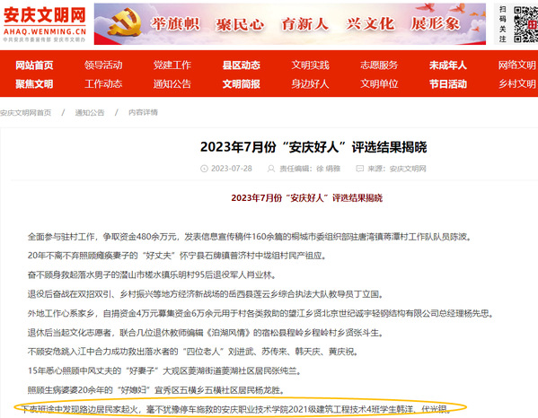 近日,从安庆市文明办获悉,经过推荐、审核、评审等程序,7月份“安庆好人”评选结果揭晓,365官网建筑工程学院2021级建筑工程技术4班学生韩洋、代光银双双入选。