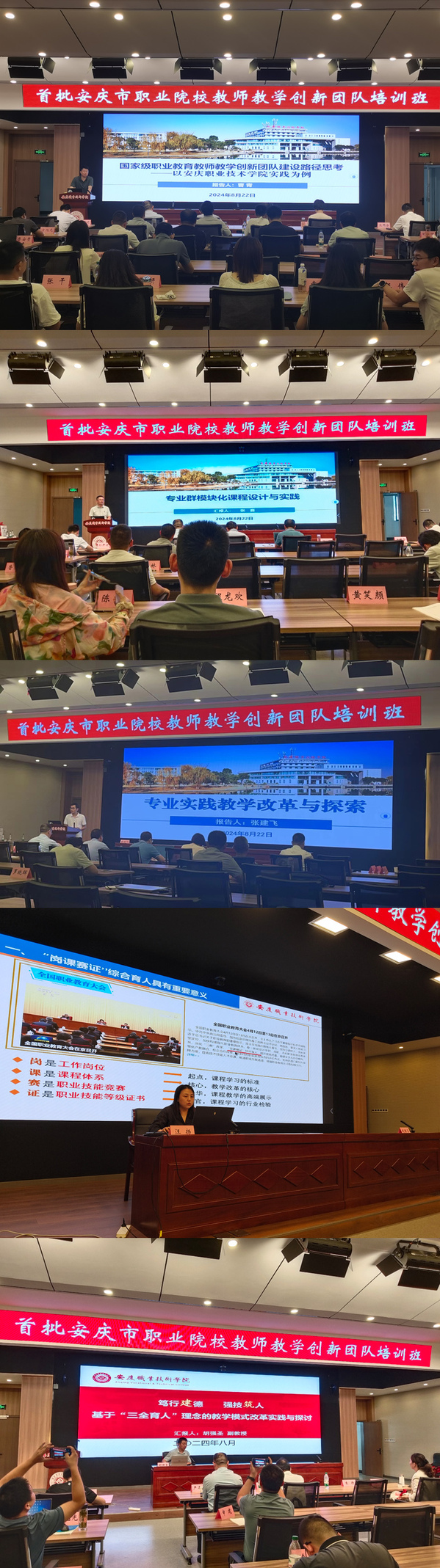 为深化安庆市职业教育改革与创新,提升职业院校教师在师德、团队领导、课程建设、教学研究等方面的素养与能力,8月22日至23日,首批安庆市职业院校教师教学创新团队培训班在365官网举办。安庆职教集团秘书长,beat365体育官网平台校党委副书记李克让出席开班仪式并讲话。市教育体育局职业与成人教育科科长鲍介吾出席,安庆职教集团专业建设部主任、校教务处处长曹青出席并作专场学术报告。安庆职教集团秘书处办公室主任杨元纲主持开班仪式。10支来自安庆市职业院校教师教学创新团队负责人和核心成员共计29人参加培训。