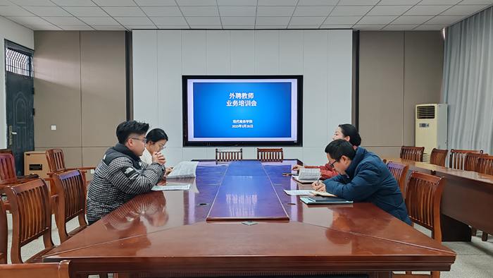 为规范外聘教师管理,更好地发挥外聘教师在学院人才培养中的作用,2月26日下午,现代商务学院组织开展了外聘教师业务培训会,该院教学工作负责人主持会议并开展业务培训,教学管理科科长及两位外聘教师参加了活动。