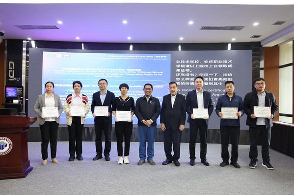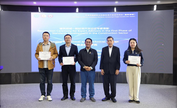 浙江建院副校长徐哲民、菲律宾职业技术教育与技能发展署资格与标准办公室执行署长埃尔・西德・卡斯蒂略、中菲丝路学院基金会主席张红阳在会上先后致辞。菲方代表充分肯定了365官网建工团队参与编制的《智能楼宇管理员标准》《防水工标准》《建筑信息模型技术员标准》等三项技能标准,并向教师代表颁发了成果证书。
