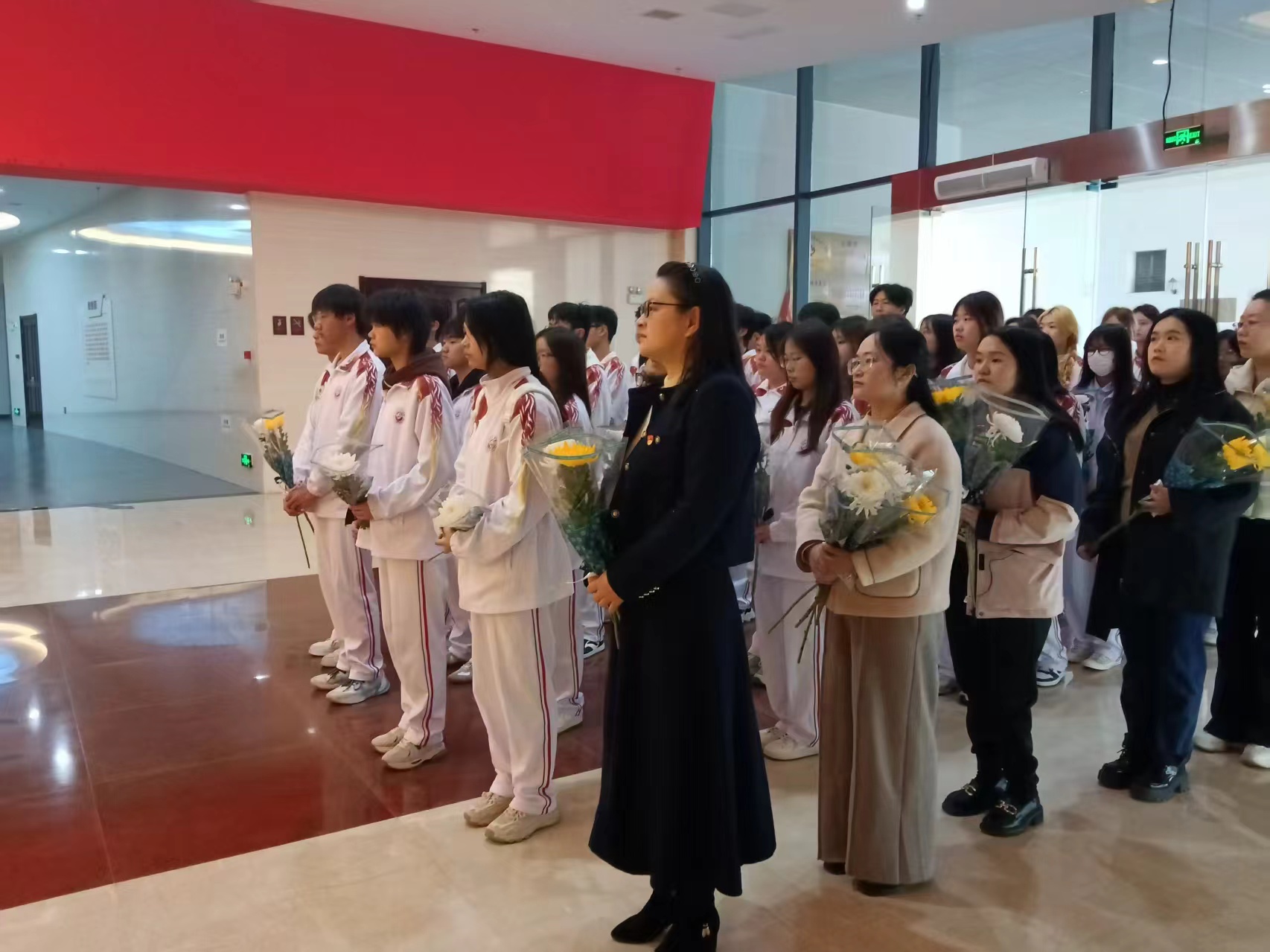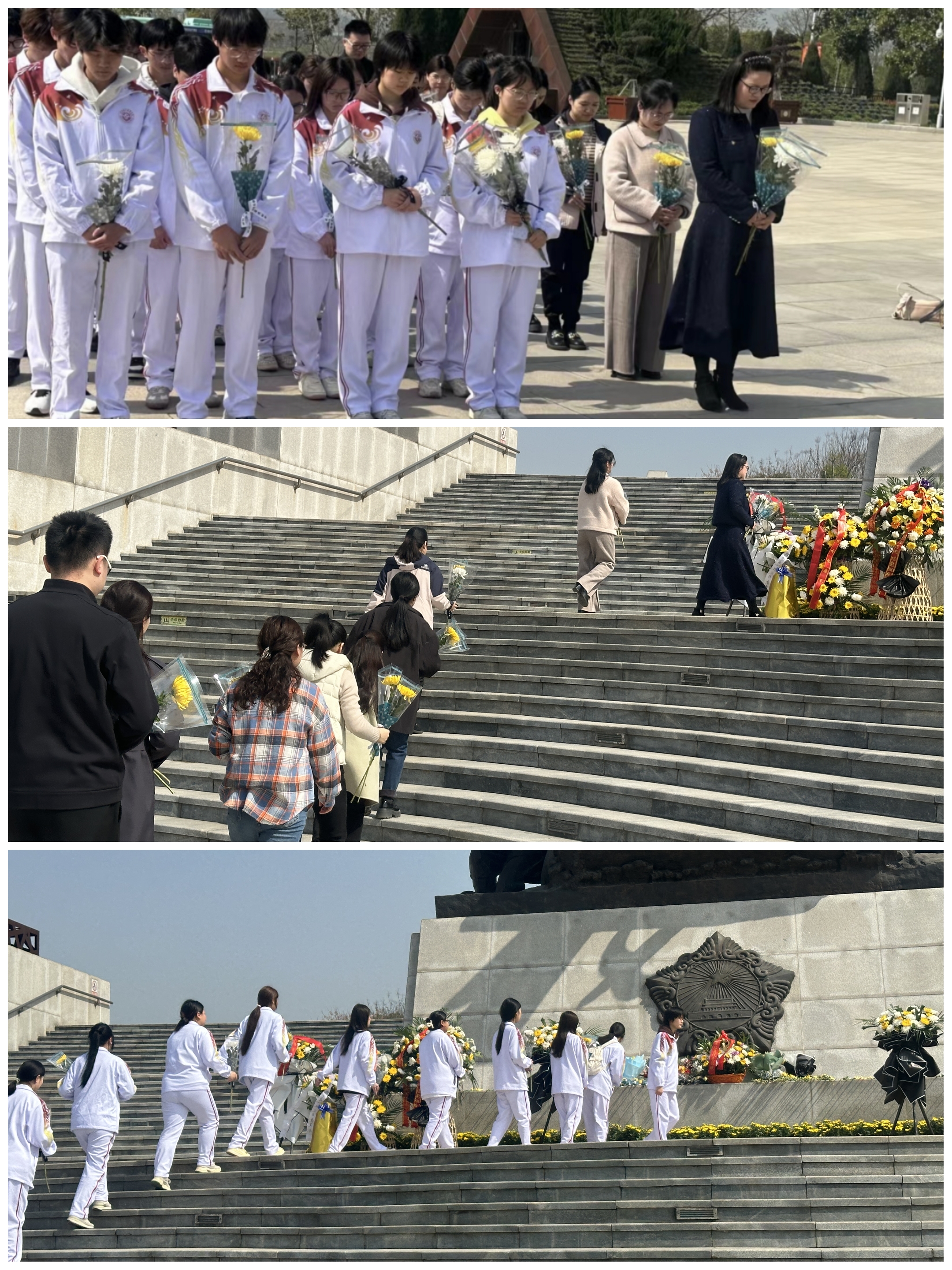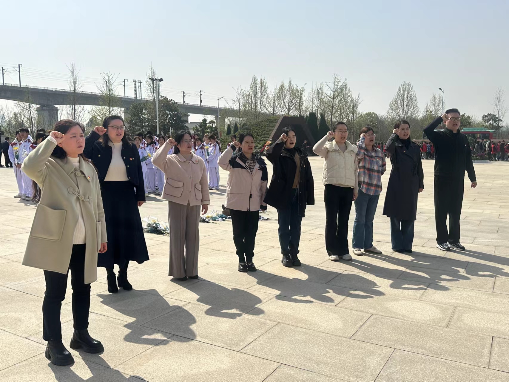 在庄严肃穆的烈士陵园纪念广场,全体师生整齐列队,怀着崇敬之情向革命先烈鞠躬默哀,依次向烈士纪念碑敬献鲜花,表达对革命先辈的深切追思。学生代表苏思源在发言中表示:“作为新时代青年,我们要继承革命先辈们的遗志,努力学习,奋发图强。我们要向他们一样,有坚定的信念和不屈的精神,为祖国的繁荣富强贡献自己的力量。”随后,教师党员面向党旗重温入党誓词,铿锵有力的誓言回荡在陵园上空,彰显了立德树人、为党育才的坚定信念。