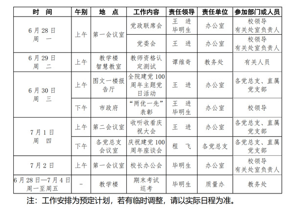 2020-2021学年第二学期第18周(6.28-7.4)工作安排