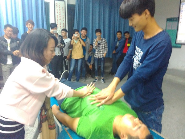 培训现场杨护士首先介绍了心肺复苏的概念、意义,其次杨护士介绍了心肺复苏的三部曲:(1)、手指按压;(2)、开放气道;(3)、人工呼吸。杨护士反复提出对当事人采取心肺复苏时,必须动作到位,方法正确,否则无法达到预期效果。最后,杨护士以真人为例,现场演示心肺复苏方法、要领、步骤,然后同学轮流操作。通过杨护士的指点,同学们反复操作,大多数同学初步掌握了心肺复苏的要领。
