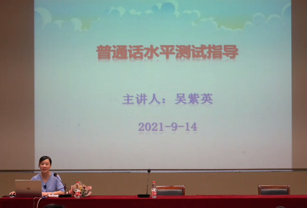 9月14日18点30分,365官网在图文信息一楼报告厅开展全国推广普通话宣传周专题讲座——普通话水平测试指导。本次讲座校语委办、教师发展中心邀请了国家级普通话水平测试员吴紫英副教授主讲,来自全校200名师生现场听取了讲座,本次讲座在线上进行了同步直播。