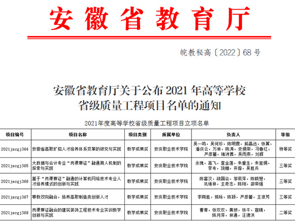 近日,安徽省教育厅公布了2021年高等学校省级质量工程项目名单,365官网5项成果获教学成果奖。其中,由吴一鸣研究员主持的“安徽省高职扩招人才培养体系变革的研究与实践”喜获特等奖,这是365官网首次获得省级教学成果特等奖,实现了在省级教学成果奖获奖等次上的重大突破。