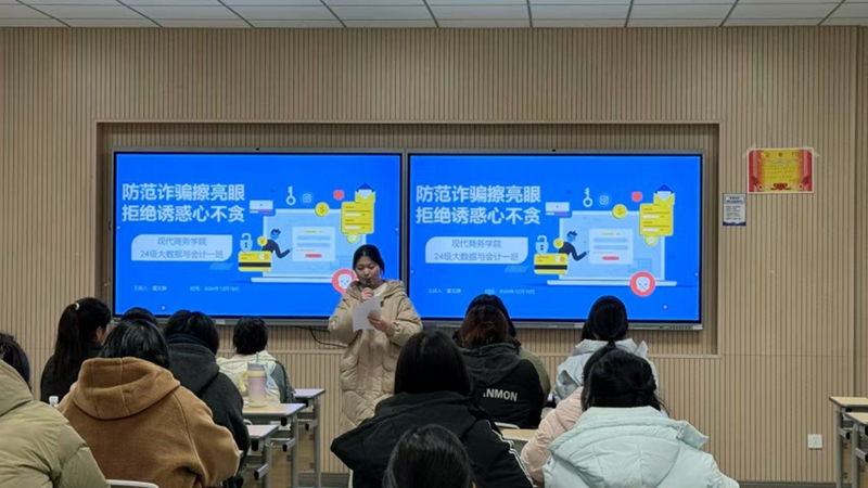 为进一步做好学校防范电信网络诈骗工作,构建和谐平安校园,切实做好电信网络诈骗的防范教育,有效提高学生识骗防骗的意识和能力,保障学生的财产安全。根据学校《关于开展反诈宣传月活动的通知》要求,12月18日,现代商务学院24级大数据与会计一班组织开展“防范诈骗擦亮眼,拒绝诱惑心不贪”为主题的反诈主题班会。