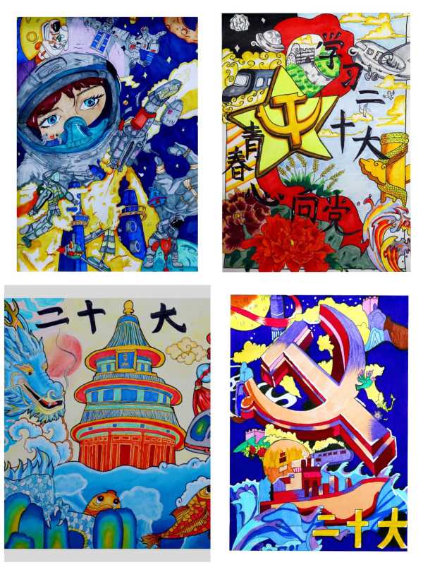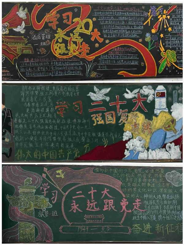 为进一步学习宣传贯彻党的二十大精神,歌颂党百年奋斗丰功伟绩,教育引导团员青年树立听党话、跟党走的坚定信念,院学生科、团总支组织各班团支部开展“巧绘党的二十大· 画笔颂党恩”主题绘画和黑板报比赛活动。各团支部积极响应,认真策划,精心准备,最终评出黑板报比赛一等奖22级酒店管理与数字化运营1班、二等奖22级酒店管理与数字化运营2班、三等奖婴幼儿托育服务与管理1、2、5班。婴幼儿托育服务与管理专业学生,结合本专业的绘画课程,组织学生进行以“学习党的二十大,永远跟党走”为主题的绘画比赛,各班学生积极参加,认真备赛,每位学生的作品都栩栩如生表达了对党和国家祝福。