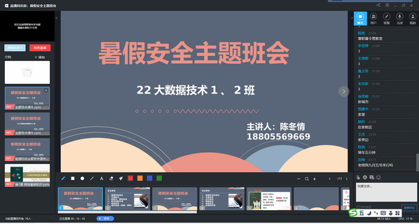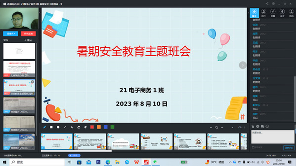 本次活动覆盖全校2021级、2022级9000余名学生。活动中,各班级依托腾讯会议、钉钉、超星教管系统等网络平台,围绕暑期学生防溺水教育、防诈骗安全教育、交通安全教育、实习安全教育、网络安全教育、食品安全教育和用水用电以及防火安全教育等有关学生人身和财产安全的多个方面精心准备了内容丰富、形式多样的线上“云”班会,积极开展安全主题教育。做到了安全教育不放假,学生离校不离心。