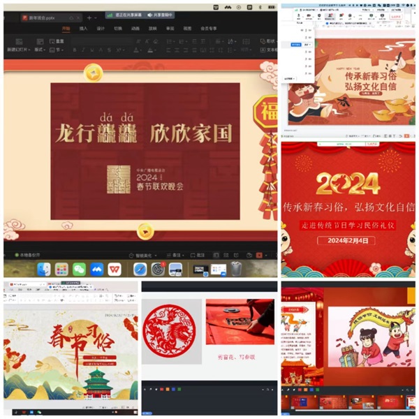 在“云”班会上,辅导员通过图片、视频、讲故事等途径,积极开展专题教育。以传统文化教育为主导,做好假期安全、新年规划、健康生活、社会实践以及心理健康等方面教育,有针对性地进行人文关怀。来自河南的辅导员王吟诗老师讲述了他们那里热闹非凡的舞龙舞狮表演,以及家家户户贴春联、放鞭炮的喜庆场景。来自广西的辅导员赵雨青老师则带领大家领略了壮族的歌舞和美味的五色糯米饭。河北、江西、贵州、云南的学生们也分享了他们家乡独特的春节风俗,如打糍粑、写对联、做年糕等。