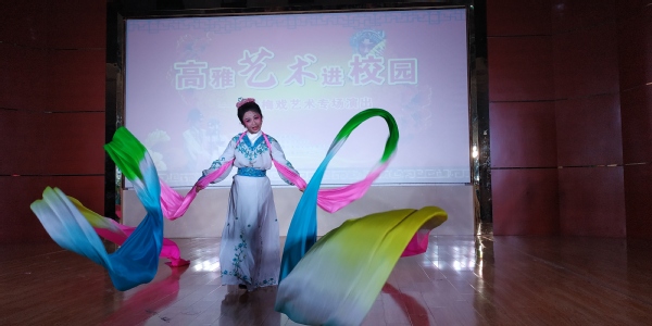 演出在经典曲目《鹊桥》的表演中拉开了序幕。演员的唱腔优美,舞姿妙曼,引来了同学们赞叹连连,《打猪草》描述了一对青年男女因打猪草损坏了竹笋产生矛盾,通过对歌化解矛盾的故事;《天女散花》、《推车赶会》、《开门调》等一个个经典曲目纷纷展现在师生面前,观众被演员们的精彩表演深深吸引;黄梅歌舞《红梅赞》将晚会气氛推向高潮,激昂的音乐响起,“江姐”高举红旗在舞台上奔跑,灯光与背景投影交相呼应,仿佛将观众们带回到了那个热血的革命年代。整场演出优美的唱腔感人肺腑,铿锵的鼓点扣人心弦,诙谐的对白令人捧腹,五彩的戏服华丽炫目。大家在短短的一个半小时内享受了一场视听盛宴,感受到了黄梅戏艺术的巨大魅力。
