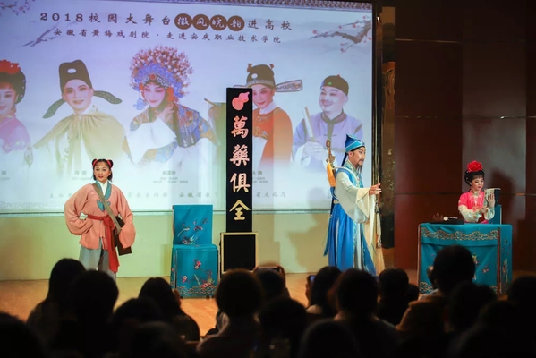 演出在黄梅戏《村姑戏乾隆》中拉开序幕,优美的唱词和演员完美的表演赢得现场观众的阵阵掌声。国家一级演员、梅花奖获得者孙娟演绎的黄梅戏经典唱段——《谁料皇榜中状元》《到底人间欢乐多》让观众瞬间感受到黄梅戏的艺术魅力。新编黄梅小戏《戏牡丹》故事情节跌宕起伏,演员生动幽默的演绎不时引得观众捧腹大笑。黄梅戏“五朵金花”之一、国家一级演员、梅花奖获得者吴亚玲、国家一级演员周珊带来的黄梅戏对唱《十五的月亮为谁圆》《夫妻双双把家还》,艺术家优美唱腔震撼了全场,全场掌声雷动。国家一级演员王成领衔主演的新编黄梅小戏《六尺巷》,讲述的是清康熙年间,宰相府张家和吴家大院毗邻而居,两家为了一道墙争得不可开交,引起轩然大波,路人注目。宰相张英得知,写出“让他三尺又何妨”的书信,使纠葛冰释,并延伸出一段礼让谦让的佳话。剧中弘扬中华传统文化的谦和礼让精神得到全场师生的共鸣,演出完美谢幕。