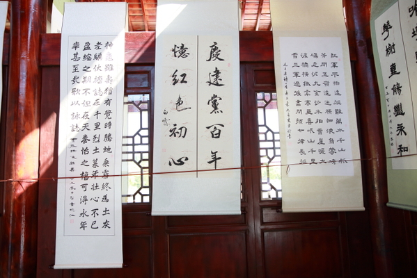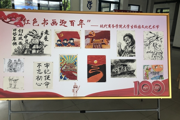 6月22日,“永远听党话·永远跟党走”庆祝建党百年传承中华经典书画作品展在学校水榭长廊举行。校党委宣传部、校团委、公共基础部、现代商务学院、语委办遴选出百幅优秀书画作品。此次活动由特色学生社团逸风书法社具体承办,参展作品以书法作品为主,体兼篆隶楷草行,韵步汉唐魏晋风。步入展厅,“永远跟党走”“四个自信”“社会主义核心价值观”及红色革命诗文等主题内容十分醒目,充分展现了广大师生的爱党爱国之心和对优秀传统文化的热爱之情。轩窗廊榭古朴雅致,莲叶菡萏清香盈怀,将红色主题和喜庆氛围衬托得鲜明浓厚;信念美、人文美、景观美、自然美统一和谐,相映成趣,吸引了一批又一批师生驻足观赏。