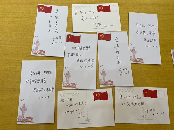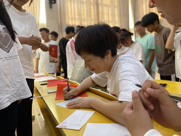 在寄语华夏环节,同学们邀请李进恩院长和许咏梅书记在明信片上书写寄语,并合影留念。