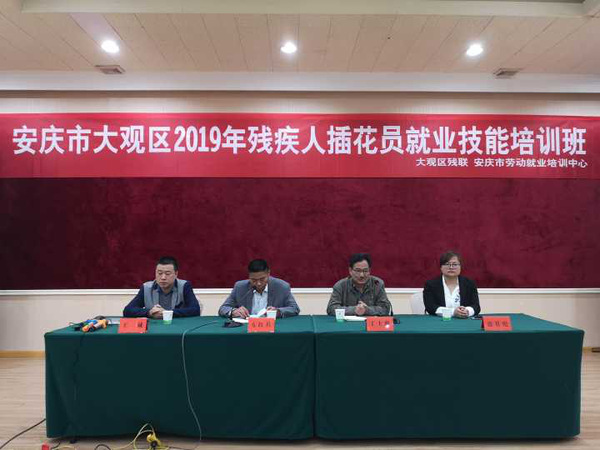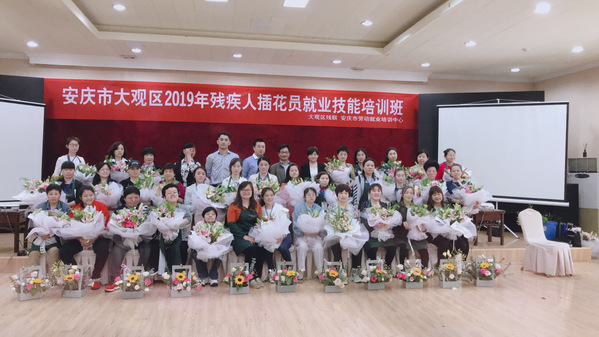 4月17日上午,安庆市大观区2019年残疾人插花员就业技能培训班在安庆大酒店隆重开班。此次培训班由大观区残联和安庆市劳动就业培训中心联合举办,来自全区40名有就业能力和愿望的女性残疾朋友参加培训,安庆市劳动就业培训中心主任丁士胜、大观区残联党组书记方红兵出席开班仪式。