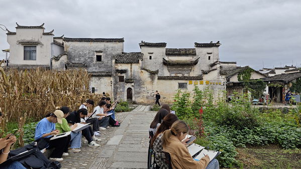 在写生实践中,师生们深入屏山、宏村等地了解了徽派建筑造 型特点和当地的自然风情。面对别具一格的古村之景,同学们更加真切的感受到大自然和徽派建筑的魅力,如水墨画般的粉墙黛瓦,造型独特的马头墙和砖木石雕以及层楼叠院、高脊飞檐无不让人惊叹不已。
