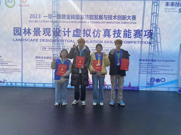 11月11日,2023 一带一路暨金砖国家技能发展与技术创新大赛“园林景观设计虚拟仿真技能赛项”在河南农业职业技术学院举办,来自全国28个省、市、自治区193支队伍参加了此次比赛。经过一整天的紧张比拼,经农林与服装学院唐长贞老师、哈满林、葛尹睿三位老师指导,由22园林技术班张成瑜、刘子翔组成的2队和张晨晨、张永乐组成的1队分别获得二等奖和三等奖。