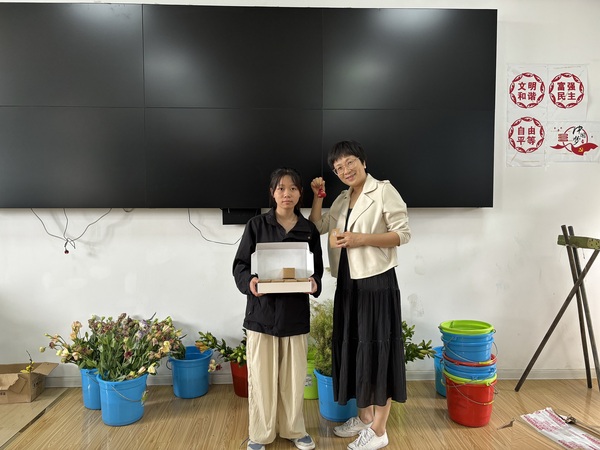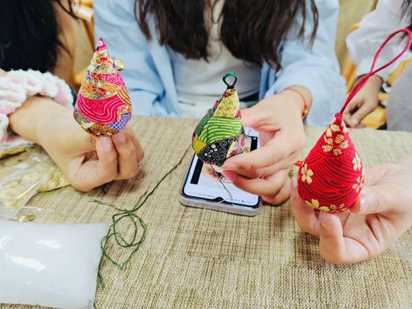 在端午香囊制作环节,志愿者们为同学们准备了针线、剪刀、流苏穗子等物品,在视频教学下,一只只手工香囊就完成了。看着自己动手制作的香囊成品,同学们成就感十足。活动结束后,同学们为老师送去了手作香囊和端午祝福。