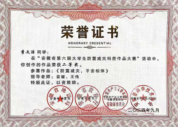 该比赛由安徽省地震局、安徽省教育厅主办,比赛为弘扬科学精神,普及防震减灾科普知识,提升公众防震减灾意识,大赛主题为“防震减灾 科普先行”。李文浩同学在众多本科生、研究生等更高学历层次的强劲对手面前没有退缩,凭借对防震减灾事业的热爱和对设计的执着追求,精心打造了《龙小伴》这一富有创意和教育意义的IP形象。在创作过程中,不仅克服了技术上的难题,还在有限的时间内深入研究防震减灾知识,保证了作品既有趣味性又具实用性。