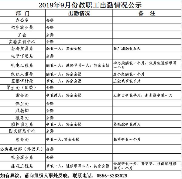 经各部门提交的教职工考勤表,结合学院考勤系统数据,组织人事处统一汇总,现就2019年9月份教职工出勤情况公示如下:
